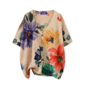 Cotton and linen knitted short-sleeved 2024 summer new retro printed ethnic style cardigan T-sleeve